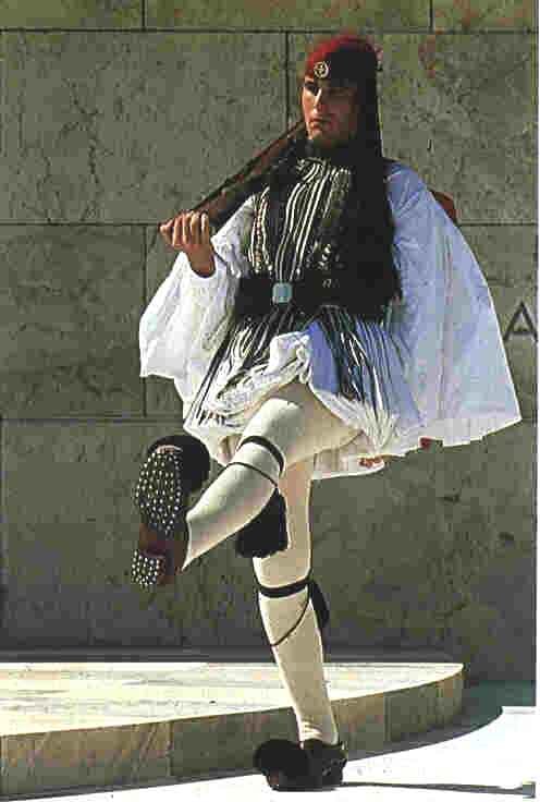 Вечером я отправился обратно, уже по проторенной дорожке. Однако выяснилось, что парк закрывается около шести часов вечера. Решив его обойти, я направился в сторону президентского дворца. Улица, примыкающая к парку, была освещена редкими фонарями, и временами приходилось идти почти на ощупь.. И вдруг (в полнейшей тишине - машин в этот момент не было) в паре метров от меня неожиданно раздается: "топ, Хлоп, ЛЯЗГ!" - и все снова погружается в тишину. Перепугался.. Вскоре выяснилось, что это один из эвзонов - президентских гвардейцев - проделывал ежечасное ритуальное притопывание. Днем множество туристов собираются, чтобы наблюдать этот ритуал.