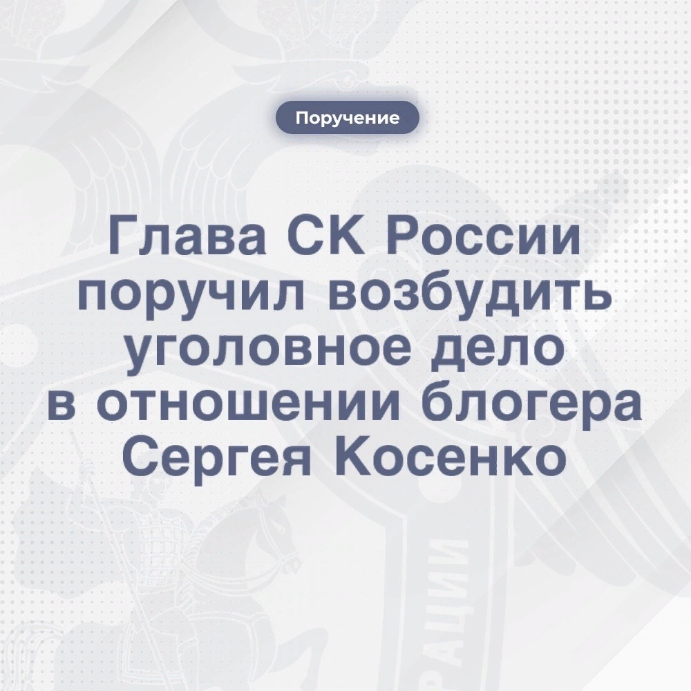 Председатель Следственного комитета Российской Федерации Александр Иванович Бастрыкин в связи с обращением представителей государственных органов и общественных институтов поручил Главному следственному управлению СК России возбудить уголовное дело в отношении русскоязычного блогера Сергея Косенко по факту совершения им противоправных действий в отношении новорожденного ребенка.