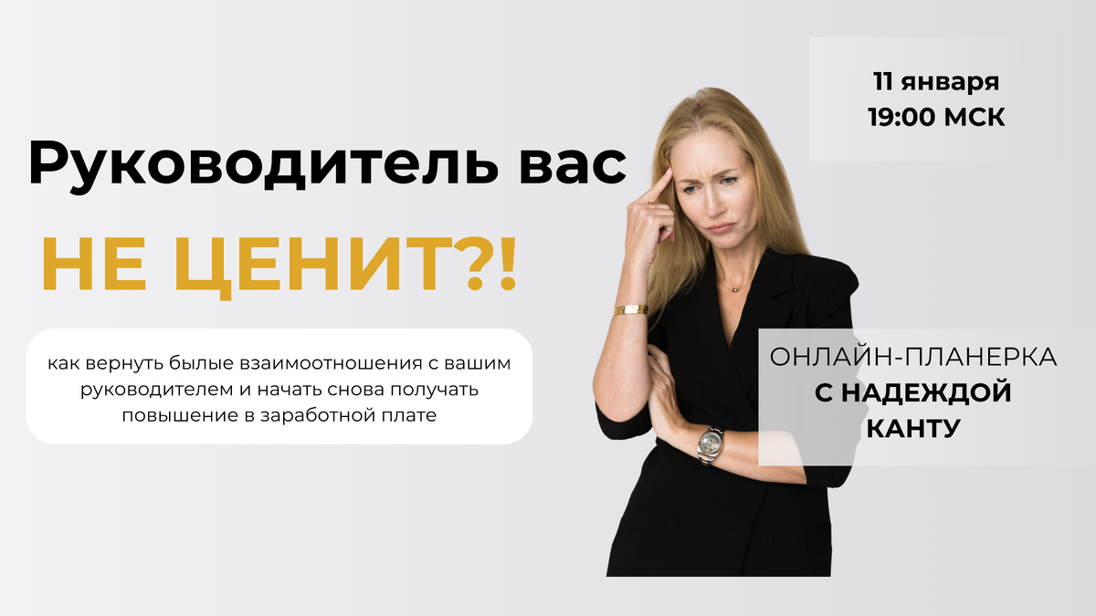 Недавно я заметила в своих социальных сетях очень похожие друг на друга вопросы. Подписчики описывали мне одну и ту же ситуацию. Девушка/Женщина работает много лет на одной работе, в первые годы работы получала похвалу и премии, но последние несколько лет/месяцев все сошло на нет и превратилось в рутину. Нет продвижения по карьере. И в конце вопрос: “Может ли быть такое, что руководитель меня не ценит?”. Мой короткий ответ - “Да”, но не спешите расстраиваться! Дело в том, что ценность любого человека тускнеет, когда к нему привыкают, знают чего от него ожидать, где надавить, где ласково попросить. Зачем что-то менять, если все итак работает? Такое не раз случалось в карьере моих учениц и я с уверенностью могу сказать, что это легко изменить. ⏰ 11 января в 19:00 по Мск я проведу для вас онлайн-планерку “5 стратегий получать больше, чем коллега”, на которой мы вместе в вами в прямом эфире разберем 5 действительно работающих методик, которые помогут вырасти в должности и заработной плате