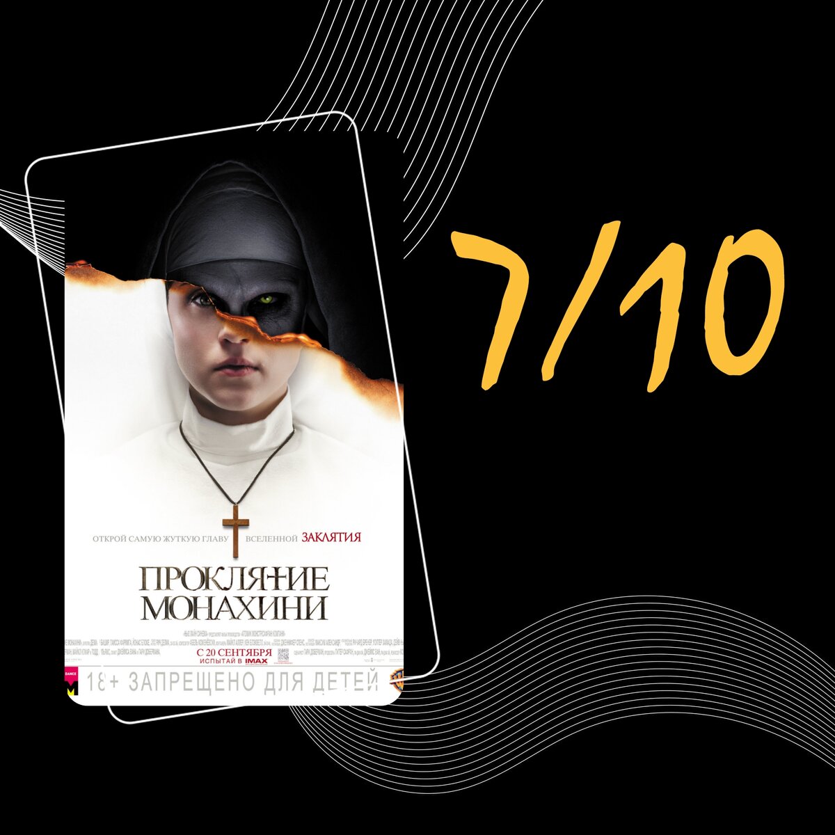 США, 2018, ужасы, 18+ Румыния, 1952 год. Когда в уединенном монастыре молодая монахиня совершает самоубийство, Ватикан отправляет расследовать происшествие священника с туманным прошлым и послушницу на пороге невозвратных обетов. Рискуя не только жизнью, но и душой, они сталкиваются со злобной силой, принявшей облик демонической монахини. Смотрел я данный фильм очень давно, и остался очень расстроенным, что пришлось поставить ему 4/10. Когда я решил пересмотреть спустя 7-6 лет, то я просто удивился, какой на самом деле мощный проект. В фильме нам рассказывается про самого мощного призрака, которого мы уже встречали в кинокартине "Заклятие". Здесь представлены события ещё до "Заклятия". И считаю, что режиссёры шикарно преподнесли всю эту историю. Достаточно интересно смотреть за всем произошедшим. Фильм тяжело поставить на паузу, из-за всего происходящего. Саму локацию в Румынии выбрали потрясающую. Настолько атмосферный монастырь, настолько мрачная, жуткая история, что аж мурашки