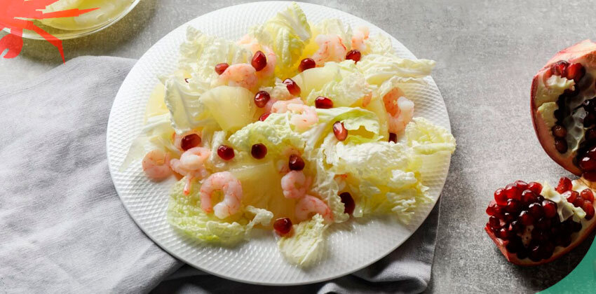 Ингредиенты: Для начала отвариваем креветки, даем им остыть, очищаем. Затем нарезаем пекинскую капусту. С ананасов сливаем сок и нарезаем крупными кусочками. Берем салатник, кладем в него капусту, ананасы и креветки. Солим и перчим по вкусу. Сбрызгиваем лимонным соком. Украшаем зернами граната. Блюдо готово. Приятного аппетита! Источник: https://wildcrab.ru/news?id=2286