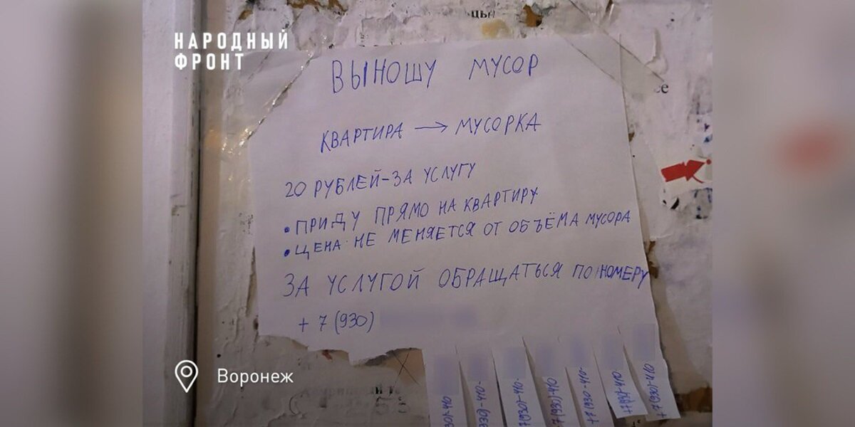 В одной из многоэтажек на улице Ломоносова появилось милой объявление о выносе мусора за небольшую плату. Об этом во вторник, 9 января, рассказали в пресс-службе ОНФ по Воронежской области. Ребята организовали небольшой бизнес и за 20 рублей готовы выбросить мусор из любой квартиры в доме. Юные предприниматели уточнили, что сумма фиксированная, то есть она не изменится, если отходов много. На объявлении они оставили свой номер телефона. По словам общественников, взрослые и дворник от идеи в восторге .Телефон не смолкает с утра до вечера, а на контейнерной площадке порядок. — Воронежские коммунальщики! Мотайте на ус. Оказывается, можно работать хорошо и при этом не терроризировать людей невменяемыми расценками, — написали активисты. Ольга Антипова