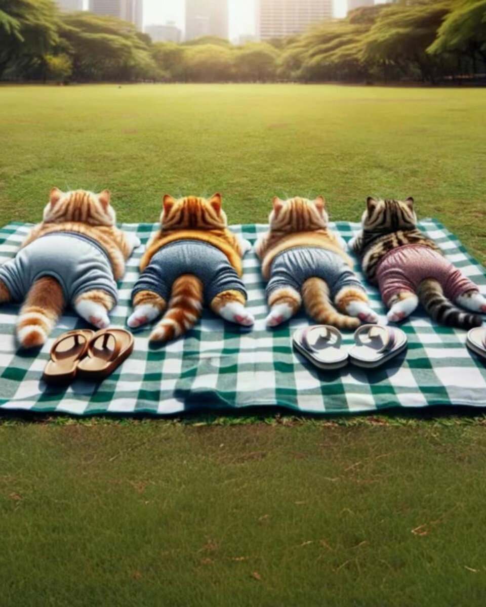 Какие же они няшки! Котики, созданные искусственным интеллектом, отдыхают летом в парке. Когда мир кажется серым, котики раскрашивают его своей пушистой магией. Как хочется лета, правда?