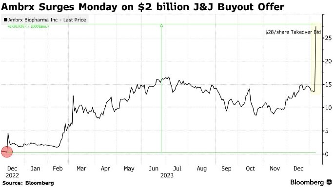 Держатели Ambrx, купившие за гроши, получили прибыль в 6700% на заявке J&J. J&J соглашается купить разработчика лекарств по цене $28 за акцию или $2 млрд. Сделка состоялась спустя чуть более года после того, как компания достигла рекордно низкого уровня Давно верящие в Ambrx Biopharma Inc. получают щедрую прибыль, поскольку предложение Johnson & Johnson о выкупе оценивает акции биотехнологических компаний более чем в 6700% от их рекордно низкого уровня. Johnson & Johnson согласилась приобрести Ambrx по цене 28 долларов за акцию наличными, что примерно на 105% выше цены закрытия рынка в понедельник (см. график ниже), то есть до объявления о сделке. Последняя оценивает разработчика лекарств в 2 миллиарда долларов. Сейчас Ambrx торгуется в резком контрасте с декабрем 2022 года, когда акции закрылись по минимальной цене в 41 цент и компания рисковала быть исключенной из листинга. Согласно анализу данных, собранных Bloomberg, среди ее крупнейших инвесторов Darwin Global Fund Ltd и Cormorant