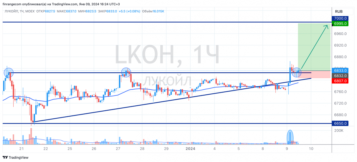 Акции Лукойла пробили уровень сопротивления на повышенном объёме в районе 6832 пунктов. Котировки растут против рынка. Такое движение скорее всего связано с ребалансировкой фондов после праздничных дней. К тому же, поддержку акциям оказывает отскок нефтяных котировок после вчерашнего падения. Если рассматривать сделку, как спекулятивную, наблюдаю пробой, затем ретест уровня. Есть вероятность роста акций Лукойла до 7000 руб. Соотношение риск к прибыли 1 к 6,5. Тем не менее, повторюсь, я бы не торопился с открытием длинных позиций, пока мы не пройдём по индексу МосБиржи ключевой уровень – 3160 пунктов. С подписчиками Finrange Premium, мы покупали акции Лукойла уже давно в среднесрочный портфель. Текущая доходность позиции почти 20% с учётом дивидендов. Также, мы в декабре открывали спекулятивную сделку в другом портфеле. Больше об инвестициях и трейдинге вы найдете в моём телеграм-канале. С уважением, Дмитрий Баженов! Основатель сервиса по анализу акций Finrange.