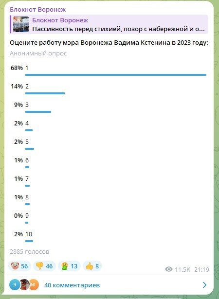 Так, из почти трех тысяч проголосовавших подавляющее большинство — 68% - поставили Кстенину единицу. 14% - двойку. А 9% - тройку. Судя по комментариям к посту, коих десятки, больше всего претензий у жителей Воронежа к сфере ЖКХ.