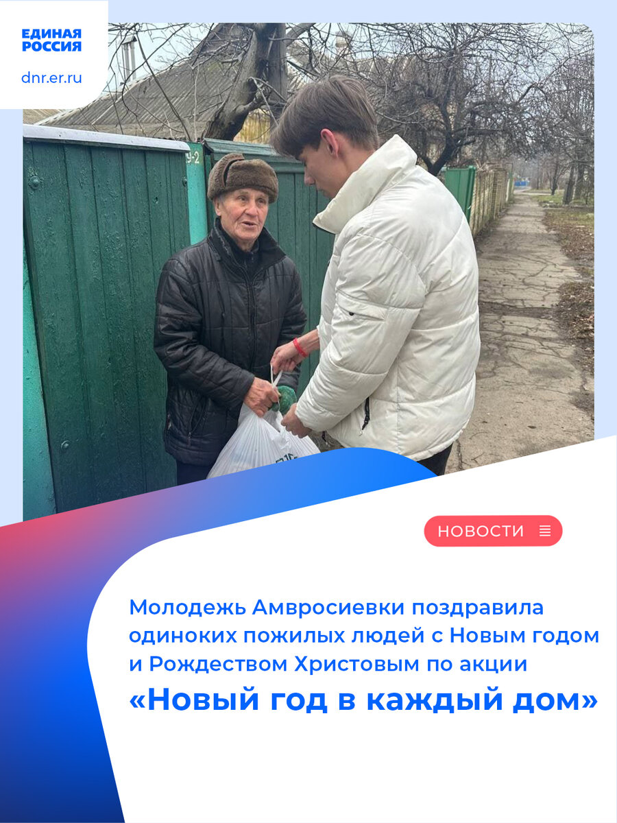 «Новый год – это время чудес. Мы всегда встречаем его в кругу близких и родных людей, загадываем самые заветные желания и ждём их исполнения. В Новый год все заслуживают немного чуда и важно, чтобы никто не остался один. Акция «Новый год в каждый дом» дает возможность нам делать добрые дела, навещая одиноких пенсионеров, заботиться о них и радовать», – сказал Кирилл Князев, руководитель Волонтерского движения Амвросиевского штаба Молодой Республики и Молодой Гвардии Единой России ДНР.