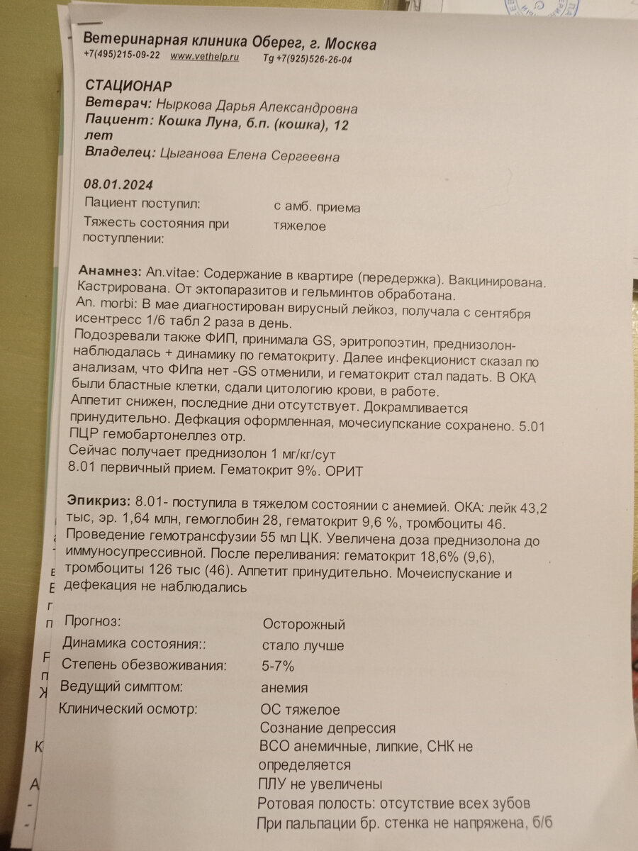 Добрый вечер всем участникам группы. Москва. Из-за не верно поставленного и потом подтвержденного в биоконтроле диагноза, Луна в течении 3.5 месяцев проходила не то лечение. Вчера случилось ЧП. Луне потребовалось срочное переливание крови, гематокрит упал 9.8. Знакомая волонтер со своим котиком помогли нам бесплатно кровью и кое как набрали денег, что бы оплатить процедуру. Через 2 дня Луне надо сдать контрольные анализы и необходима консультация онколога. Но у меня больше нет средств. Прошу вашей помощи! Иначе все было бессмысленно и она медленно в муках будет умирать... Фин. Отчет https://vk.com/topic-221010911_50365624 Группа помощи Вк https://vk.com/club221010911 ТГ https://t.me/WasyaVasileK Реквезиты для помощи с пометкой: Луна Сбербанк 2202 2036 1285 2725 Елена Ц. ☎️ +7 (916)813 80 94 (писать, не звонить) привязан к СБЕР.