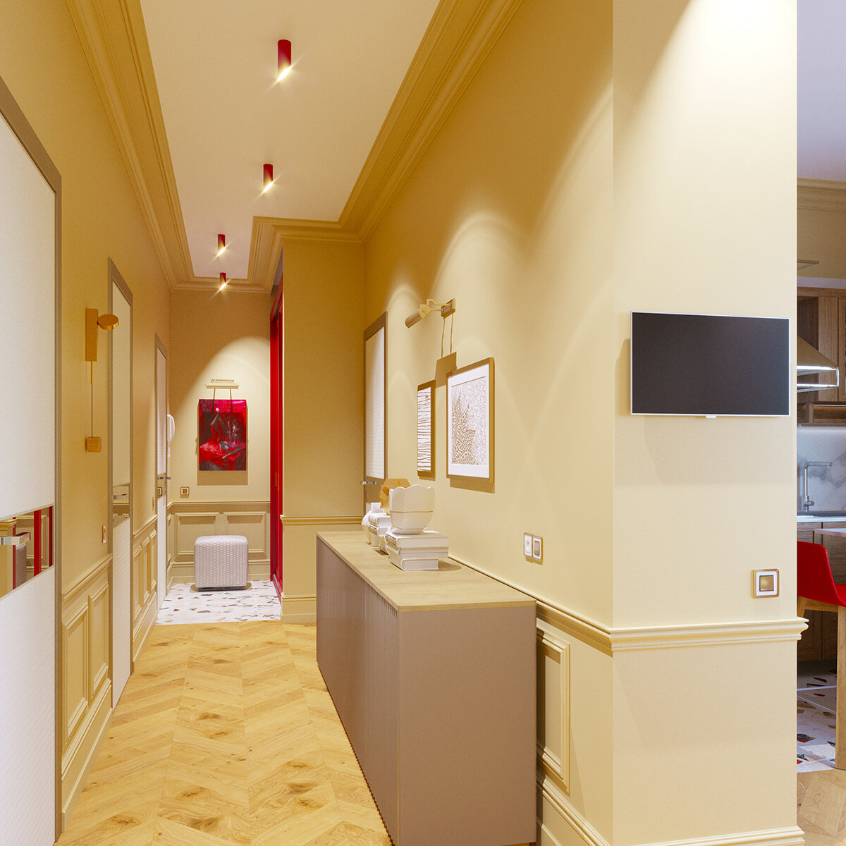 Итак друзья, с наступившим вас Новым Годом! Пусть он будет лучше, чем предыдущий, пожелаем друг другу мира и благополучия, а остальное нашепчем бокалу шампанского! Да будет так! Продолжим, проект квартиры в ЖК "Headliner".Это абсолютно конкурсный проект, но очень близкий мне "по духу". Проект в исполнении дорогой, в рамках конкурсного задания была предоставлена смета, при желании можно заменить некоторые позиции. Интерьер квартиры для молодой пары с ребенком. Жилой комплекс располагается в непосредственной близости от Москва-Сити, деловым «сердцем» мегаполиса, ориентирован на молодых, успешных людей, которые бы предпочитали жить в «гуще событий» . Хотелось создать обязательно уютное пространство, которое кардинально отличалось бы от тех, в которых проводят время современные молодые пары. В этом интерьере прекрасно сочетаются классические элементы и современная мебель. Связующий нитью в оформлении послужил основной цвет стен-цвет горчицы и топленного молока, который присутствует во всех