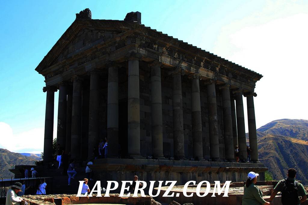 Если не знать историю Армении, то последнее, что ждёшь от этой страны, — эллинистический храм в часе езды от Еревана. Но он есть, он блистает среди гор и неизменно привлекает буквально толпы туристов. Мы не остались в стороне и решили посмотреть, что за чудо такое в селе Гарни. Здесь расположен единственный в Армении эллинистический памятник, который ещё и относится к дохристианской эпохе. Село названо по имени крепости Гарни, которая была построена в 77 году армянским царём Трдатом Первым. К I веку нашей эры относится и возведение античного храма, посвящённого богу солнца и света Михра. Его разрушило землетрясение 1679 года, и восстановлен он был только три столетия спустя. А крепость, на территории которой находилась церковь, стала летней резиденцией армянских правителей. Вход на территорию храма платный. Недлинная дорожка ведёт от кассы к памятнику, по её бокам на траве лежат камни, очевидно, когда-то бывшие украшением крепости. Древние умельцы возвели храм из двухметровых блоков ба