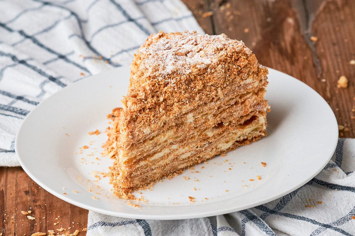 😉В народе такой называют еще "рубленным". Тесто для него готовится проще и быстрее👍, чем правильно слоеное, а слоистость от этого не меньше👇. Для теста понадобится: 200 г сливочного масла🧈, 240 г муки, 1 куриное яйцо🥚, примерно 50 мл воды. Для крема: 200 г сливочного масла + 1 банка (360 г) вареного сгущённого молока. ✅ Сливочное масло, предназначенное для теста, перед приготовлением нужно заморозить❄️. Затем мелко порубить на доске или натереть на терке в глубокую миску👇. ✅ Просеять к маслу муку и быстро, чтобы ингредиенты не успели нагреться, перетереть в крошку👇. ✅ В середине сделать углубление и разбить туда яйцо🥚. Аккуратно и быстро замесить тесто, порционно добавляя воду. ✅ Полученное тесто скатать в шар и оставить в холодильнике❄️ на пол часа. ✅ Охлажденное тесто разделить на равные части (можно использовать кухонные весы⚖️) и раскатать в тонкие коржи. Ровную форму можно придать, например, с помощью кольца👌. Последний корж можно не ровнять, так как он все равно по