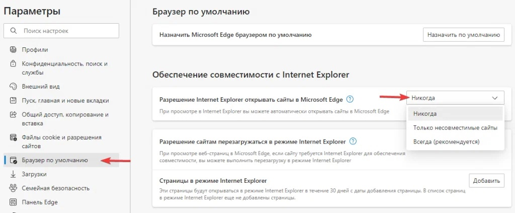 Откройте MS Edge, в правом верхнем углу нажмите три точки (...). Далее «Настройки — слева выберите раздел «Браузер по умолчанию» — в графе «Разрешение Internet Explorer открывать сайты в Microsoft Edge» установите значение «Никогда».