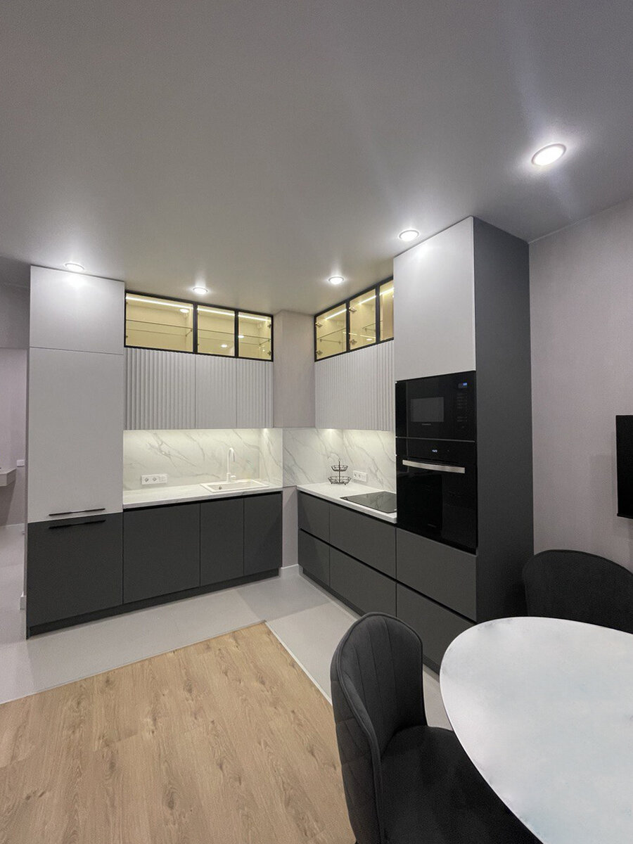На кухне, где места всегда не много, иногда пригодится сталкиваться с дополнительными "похитителями пространства" в виде вентиляционных коробов, стояков или несущих пилонов. Представьте себе сценарий: вы мечтаете о прекрасном гарнитуре, но тут же встаёт дополнительное условие задачи в виде нежелаемой конструкции на стене. Этот барьер может показаться непреодолимым. Но мы вам скажем: гарнитур можно вписать в любое пространство. Таким образом, вы создаете визуальное волшебство, при котором даже кажущиеся преграды превращаются в часть элегантного пазла вашей кухни. В этом случае ваш кухонный интерьер обретает свой уникальный стиль, а ограничения превращаются в стимул для креативных решений. В нашем проекте короб расположен в углу. Рассказываем, как сделали его незаметным и выстроили кухню вокруг него. Угловая кухня Короб оказался сопоставимой с кухней глубины, поэтому было решено установить две линии шкафов и две столешницы. Сам вентиляционный короб остается на виду, он не закрыт фасадами