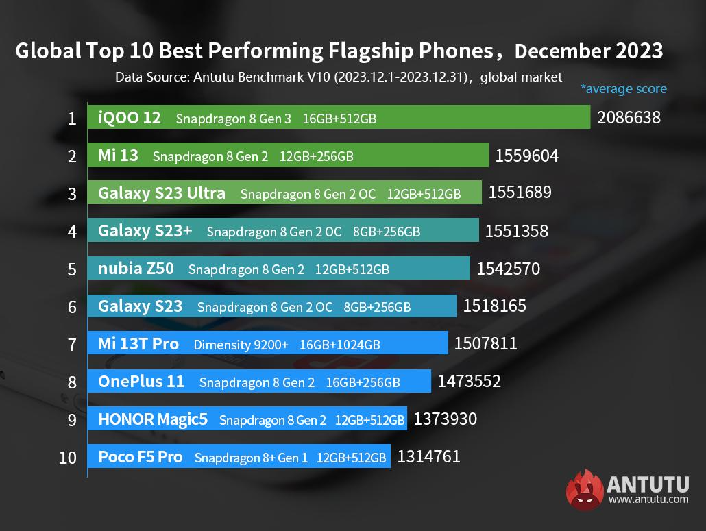 Из топа вылетели лидеры декабря 2023 года. Команда известного бенчмарка AnTuTu представила свежий международный рейтинг самых производительных смартфонов на Android. Он значительно отличается от версии для китайского рынка и претерпел изменения за декабрь 2023 года. Если в ноябре лидировал Xiaomi 14 Pro, работающий на базе Qualcomm Snapdragon 8 Gen3, за ним следовали Nubia Z50S Pro и Red Magic 8 Pro+, то в декабре эти три устройства пропали из топ-10. В новом обзоре первое место занял iQOO 12, использующий Snapdragon 8 Gen3, за ним последовали Xiaomi 13 и Samsung Galaxy S23 Ultra на базе Snapdragon 8 Gen2. В список лучших также вошли Samsung Galaxy S23+, Nubia Z50, Galaxy S23, Xiaomi 13T Pro, OnePlus 11, Honor Magic5 и Poco F5 Pro. Ранее Samsung выпустила первый гнущийся в обе стороны смартфон, а мошенники начали чаще использовать ИИ для получения денег.