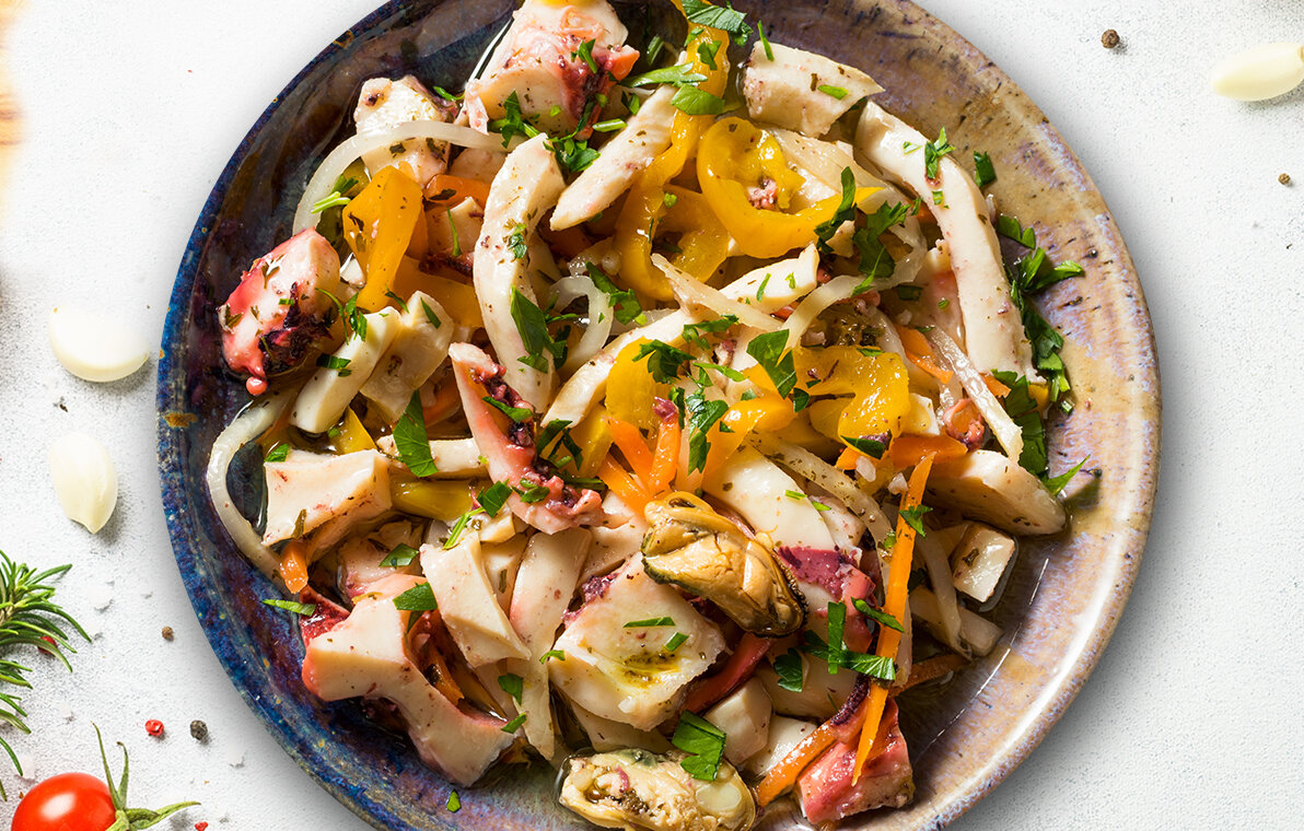 Erid: 2SDnjedwWvU Сегодня готовим блюдо, которое произведет настоящий фурор! Салат с морепродуктами по-тайски — это что-то на азиатском! Вкусный, питательный, полезный и такой простой в приготовлении — идеальный вариант закуски. Ну что, готовы попробовать? Лайфхак: используйте перец разных цветов — так ваш салат получится красочным! Вот что вам понадобится: кальмары — 2 тушки; маринованные мидии — 150 г; щупальца осьминога — 200 г; болгарский перец — 2 шт.; чеснок — 3 зубчика; зелень (любая) — пару веточек; оливковое масло — 30 мл; лимонный сок — 2 ст. л.; черный молотый перец, соль — по вкусу. Приготовление: Шаг 1 Болгарский перец промойте и нарежьте тонкими полосками. Чеснок натрите на терке или пропустите через пресс. Шаг 2 В салатнике смешайте нарезанный перец, лимонный сок, соль и чеснок. Накройте крышкой и оставьте мариноваться в течение получаса. Шаг 3 Тушки кальмаров проварите в подсоленной воде в течение 2 минут. Выложите на тарелку — они должны остыть. Шаг 4 В отдельной кастр
