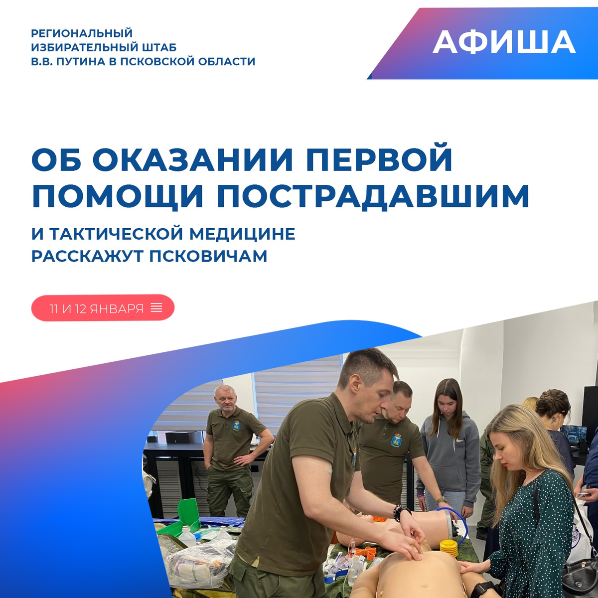 Встречу с инструкторами центра «ВОИН» проведут в Региональном избирательном штабе В. В. Путина. В Пскове на ул. Некрасова, 17/11 специалисты центра «ВОИН» расскажут собравшимся об оказании первой помощи пострадавшим и тактической медицине.