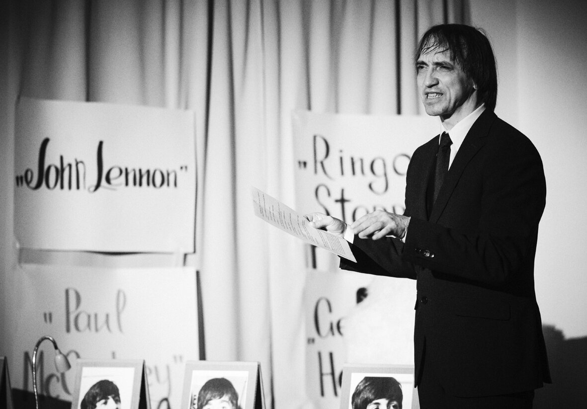Сегодня на повестке дня спектакль Заслуженного артиста А. Кобелькова – «Кинобитлз», который уже не первый год идет в камерном пространстве ТЮЗа. На этой склонной к изобразительной аскезе сцене, представитель «старой гвардии» театра и швец, и жнец, и на дуде игрец, - что срежиссирует, то и играет. Режиссерская задумка Кобелькова вполне удалась, - кажется, что ливерпульская четвёрка только что выпрыгнула из клуба сержанта Пеппера – со всей пестротой характеров, а еще захватив с собой валторну, трубу, английский рожок и флейту. То, что старожил неплохо исполняет бессмертные хиты английского квартета не приходится говорить, - он прекрасно демонстрировал певческий талант всю дофеодорьевскую эпоху. А. Кобелькову вторит С. Ревич, выступающий в роли журналиста на пресс-конференции с кумирами 60-х годов. Ему вполне удалось раскрутить клубок минувшего, - полное ощущение того, что голос доносится из репродуктора, и всем вместе нужно прислушиваться к бесконечно далёкой мелодии юности – это доволь