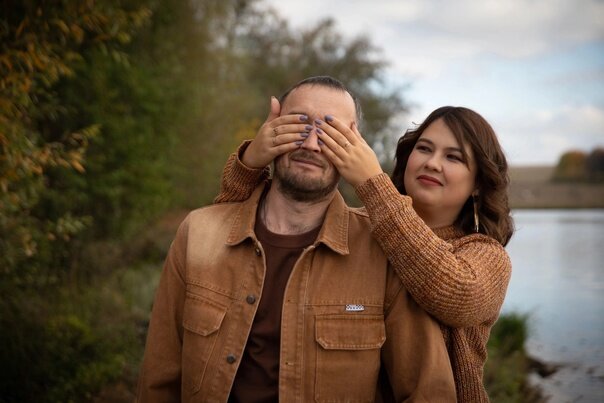 Теплая семейная прогулка по сосновому лесу в осенний сентябрьский день.