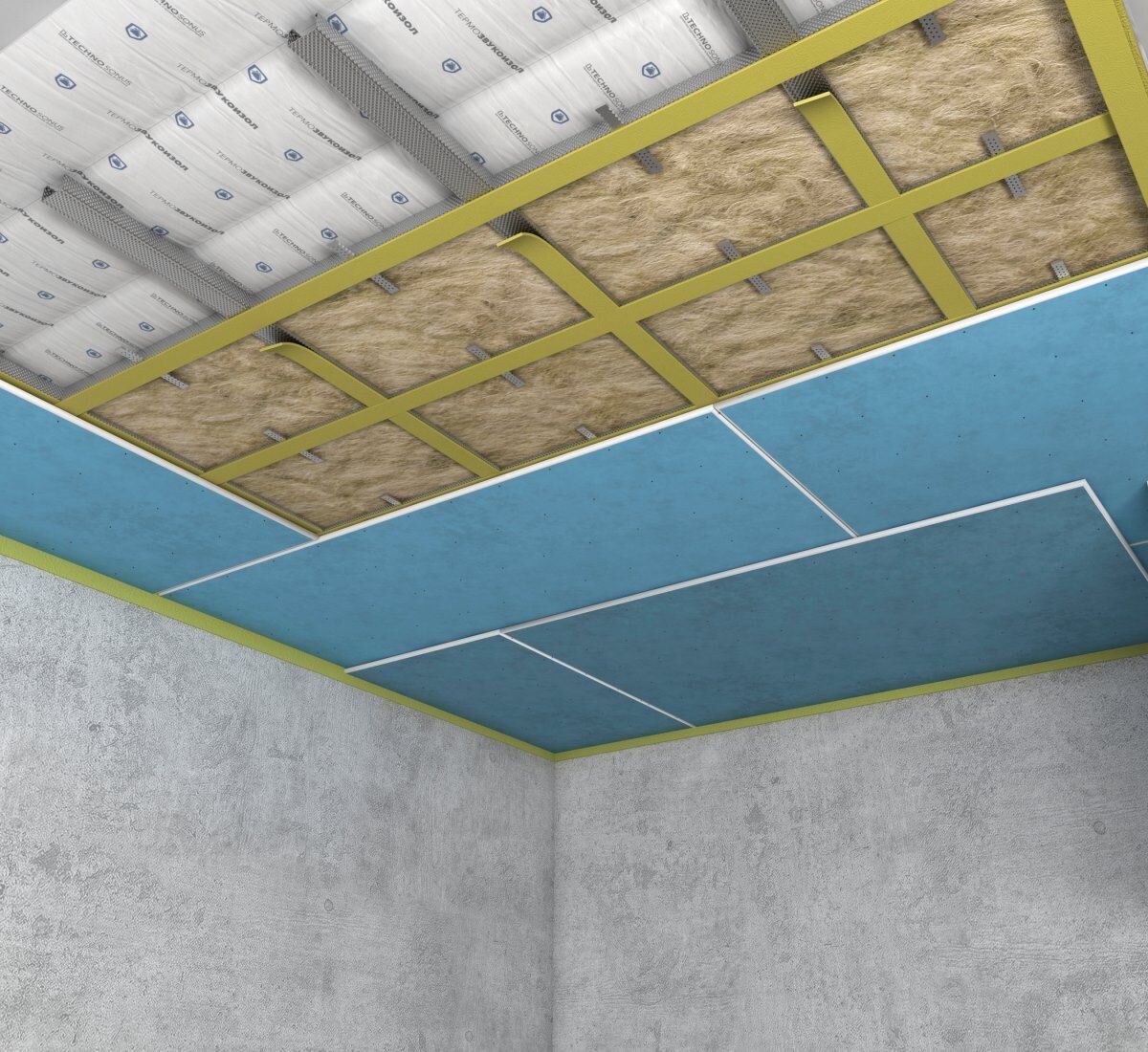 1. Крепим виброподвесы к потолку 2. Клеим демпферную ленту на профиля, которые примыкают к стенам 3. Собираем металлокаркас 4. Далее на металлокаркас мы раскладываем пористую шумоизоляционную вату Очень важно использовать шумоизоляционную вату, именно с большим содержанием воздуха, то есть пористую. Когда она лежит в пачке, она