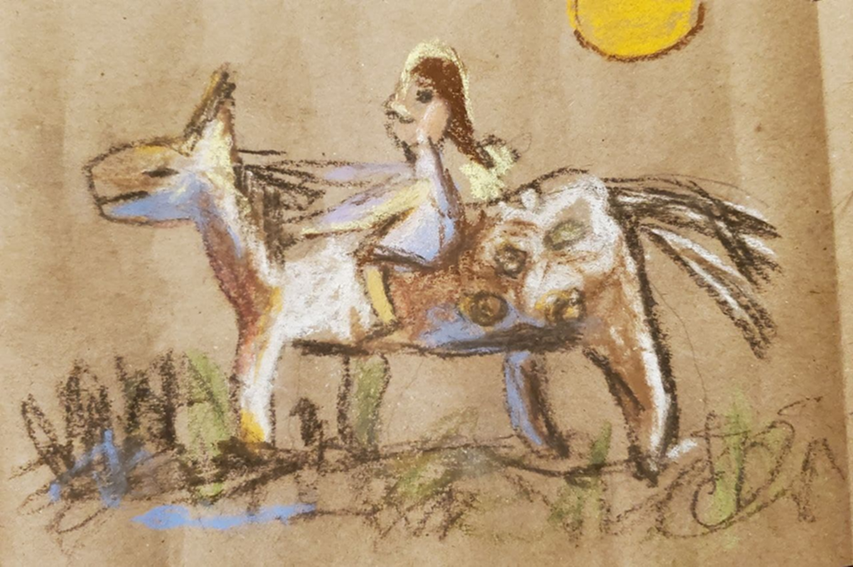 …Она появляется у бабушкиного дома, там на первом этаже приём стеклотары. Ящики с бутылками грузят на телегу, а я кормлю лошадь травой. Лошадь печально смотрит перед собой, тянется мордой к угощению, и я вижу большие стёртые зубы… Я думаю, эта лошадь тоже когда-то жила в деревне и бегала по полям, по просторам. А теперь тащит телегу по городским дорогам, и машины обгоняют её. Машины гудят и воняют, а лошадь бредёт по обочине дороги, грустно кивая головой…