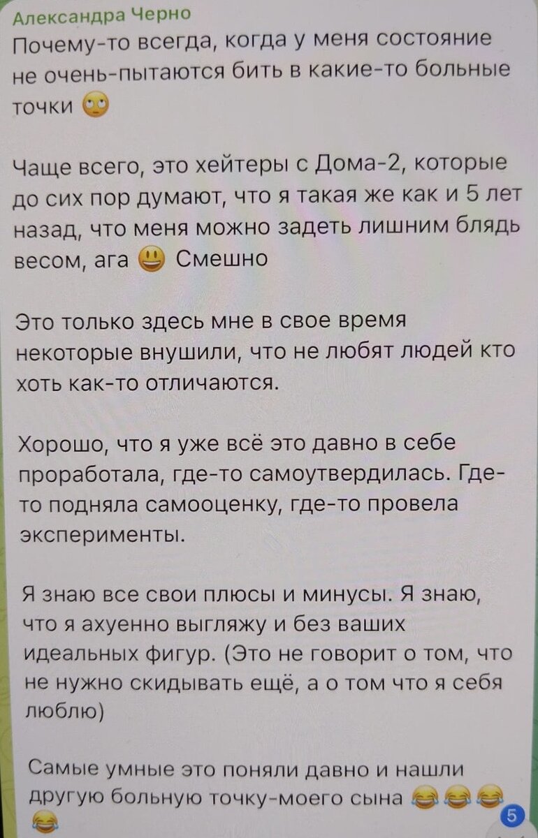 - А Александра Черно рассказала в своих соц.сетях, что это просто черная полоса и для всех она вдруг стала плохой.