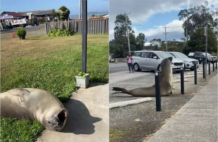 Тюлень захватил городок Тасмании: он преграждает путь машинам и отдыхает на лужайках