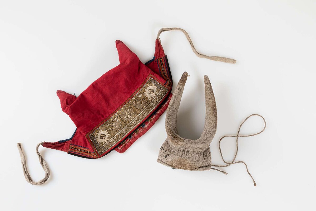 В фондах отдела этнографии русского народа находится немало рогатых кичек. Степень их «рогатости» разная: некоторые рожки хорошо видны, другие спрятаны; одни направлены вверх, другие по сторонам или назад; одни обладают значительной длиной, другие представляют небольшие отростки. В любом случае они привлекают внимание и желание рассмотреть их подетальнее. Предлагаем познакомиться с рогатыми кичками, составляющими основу головных уборов крестьянок Пензенской, Рязанской, Тульской губернии и терских казачек. Самыми длинными рогами обладает головной убор одной из групп мещёры. Здесь рога делали из дерева или ткани и вставляли в чехлы, специально выкроенные из красной ткани вместе с «чепцом» – полукруглой шапочкой, плотно облегавшей голову женщины и полностью закрывавшей её волосы. Концы рогов скрепляет шелковистая бахрома – «кутасы». А поверх «чепца» надевали еще «околыш» с золотным шитьём, шерстяной вышивкой и шелковыми лентами, а украшением головного убора служили серьги из гусиного пуха