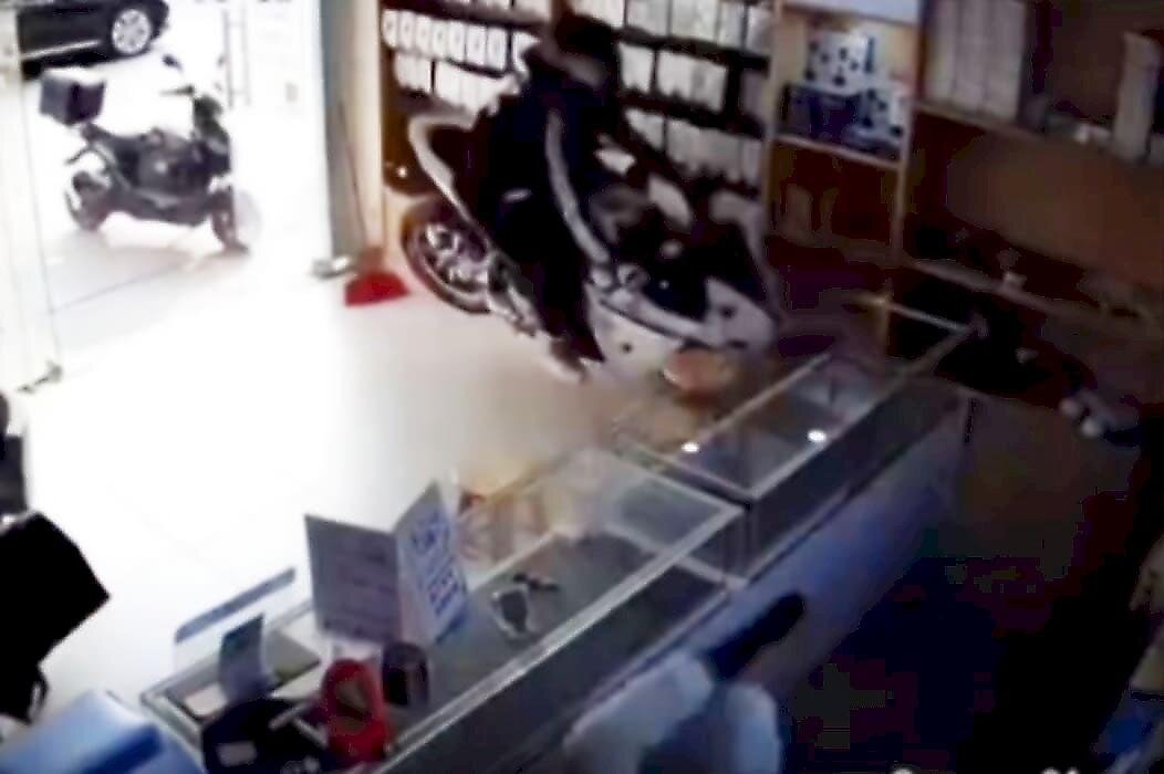 Камера видеонаблюдения, установленная в салоне, специализировавшемся на продаже средств связи, находящемся в небольшим китайском населённом пункте, запечатлела вторжение мотоциклиста, произошедшее 5 января. Местный байкер не справился с управлением своего «железного коня» и протаранил витрину с гаджетами. В результате неконтролируемого заезда никто не пострадал. Виновник происшествия обязался возместить ущерб торговому заведению.