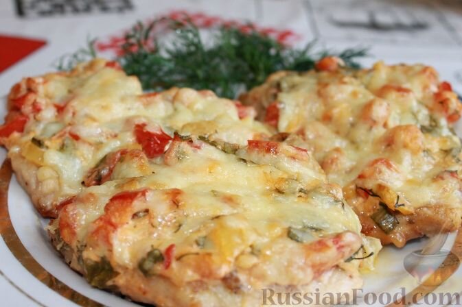 Куриная грудка "под шубой". Мягкая и сочная куриная грудка в духовке. Блюдо очень вкусное, можно готовить как в будни, так и к праздничному столу. Это простой рецепт запеченного в духовке куриного филе. Продукты (на 10 порций) Куриные грудки (филе) - 1,5 кг (у нас 2 грудки домашних куриц))) Помидоры - 2-3 шт. Перец сладкий - 1 шт. Чеснок - 5-6 зубчиков Сыр - около 250 г (100 г в начинку и 150 для посыпания сверху) Мука (для панировки) - 1 стакан Майонез - 6-7 ст.л. Горчица - 2 ч.л. Зелень свежая (укроп, петрушка, зеленый лук) - по вкусу Соль - по вкусу Перец - по вкусу Приправы для мяса (сбор) - по вкусу Масло растительное - для жарки * *