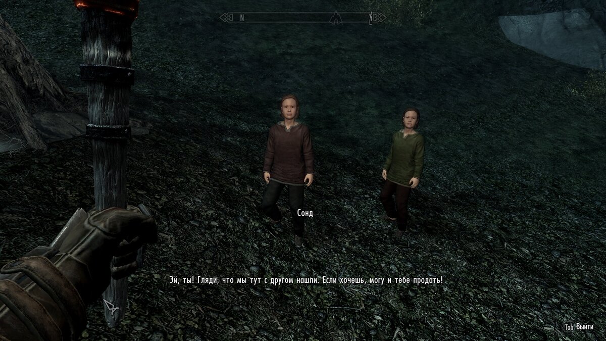 Скайрим, случайные встречи Путешествуя по гористому Пределу Скайрима, Лайма встретила двух озорных ребят. Мальчишки оказались не промах и с криками «Эй, ты! Гляди, что мы тут с другом нашли. Если хочешь, могу и тебе продать!» начали предлагать купить у них всякий хлам. Ну как тут устоять и не похвалить их за удаль и прыть. Получили ребятки септим и довольные побежали дальше, за одно показав на карте (крестьянские дети умеют читать карты🤔?) место, где они нашли этот двемерский предмет. Уникальность этой встречи в том, что Сонд - единственный ребёнок-торговец в Скайриме в целом и единственный торговец, у кого в кошельке ноль септимов. А вот в отличие от Сонда, который может сказать месторасположение Переправы глубинного народа, полноценный диалог с Боттаром невозможен.