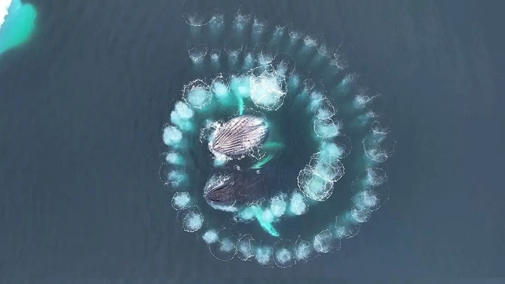На потрясающих кадрах с дрона видно кормление двух массивных горбатых китов в Антарктиде. В процессе они создали спираль Фибоначчи, также известную как «Золотая спираль». Видеограф и исследователь Пит ван ден Бемб заснял удивительные кадры кормления горбатых китов (Megaptera novaeangliae) с дрона. В процессе они использовали сети из пузырьков для охоты. Во время этой техники кормления, морские гиганты ныряют в воду под свою добычу, а затем используют дыхала, чтобы образовывать пузырьки. В результате, появляются своеобразные сети, которые помогают им ловить рыбу ближе к поверхности. Когда рыба всплывает, киты поднимаются на поверхность с широко открытой пастью и заглатывают буквально все, что встречается на их пути, в том числе рыбу, попавшую в «пузырьковые сети». Такое поведение хорошо известно биологам. Новые кадры привлекли внимание исследователей ученых из-за необычного рисунка. Во время кормления горбатым китам удалось создать идеальную спираль Фибоначчи, также известную как «золо