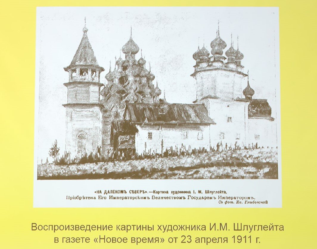 Как памятник архитектуры Кижи попали в поле зрения еще в середине 19 века. На остров тогда высадился практически десант из художников и архитекторов Академии художеств. В 1911 пейзажист Иегошуа Шлуглейт написал картину «На далеком Севере», которую приобрел император Николай 2 (мне не удалось отследить судьбу полотна, где оно находится, сохранилось ли, вот только картинка из "Нового времени"). Как уже писала, в 1921 Кижи получили охранную грамоту, финны отнеслись к острову бережно, впрочем, они пранировали присоединить Кижи в Финляндии. Есть легенда, что финский летчик отказался бомбить остров, сраженный красотой погоста.