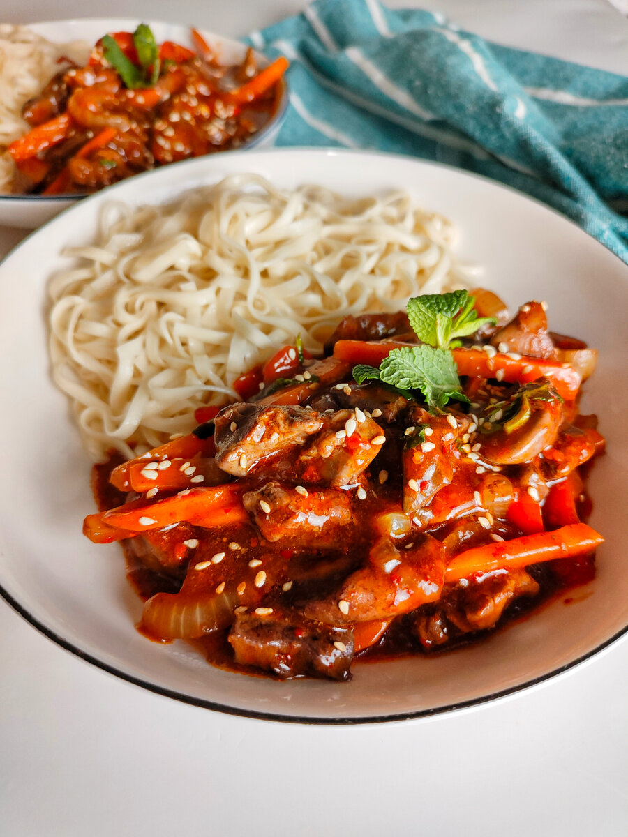 Потребуется : (2 порции) .печень куриная - 300г .морковь - 60г .лук репчатый - 60г .болгарский перец - 60г .перец красный среднего помола - среднеострый, по вкусу .мята свежая - листья 20г .масло растительное - 2 ст.л .соевый соус - 4 ст.л .крахмал+вода - 1 ст.л без горки + 60мл .лапша удон - 160г По желанию можно добавить Китайскую приправу "маласянь" - продается на wb Все ингредиенты нарежьте соломкой. Сначала хорошенько обжарьте печень и лук на сильном огне. Добавьте морковь, болгарский перец и красный молотый перец. Обжаривайте помешивая ещё 3 минуты. Смешайте соевый соус , холодную воду и крахмал, влейте в сковороду и помешивайте до загущения. Добавьте мелко порубленные листья мяты и маласянь (учитывайте соль в приправе). Лапшу удон отварите в течение 2 минут. Подавайте с жареным кунжутом . ПРИЯТНОГО