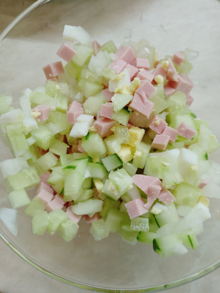 Вариантов приготовления окрошки много и каждый из них имеет право на существование. 😉 Сегодня Вашему вниманию предлагается окрошка на кефире. Все как я люблю... Просто и быстро😁 Итак, нарезаем кубиками вареное куриное яйцо, свежий огурец, репчатый лук и вареную колбасу ( или ветчину, то же вкусно). Пропорции ингредиентов на ваш вкус. Заправляем майонезом. Заливаем кефиром разведенным холодной водой в пропорции 1:1. Солим. Добавляем свежую зелень. К такой окрошке я всегда подаю отварной картофель. Картошку можно посолить и поперчить. Приятного аппетита!