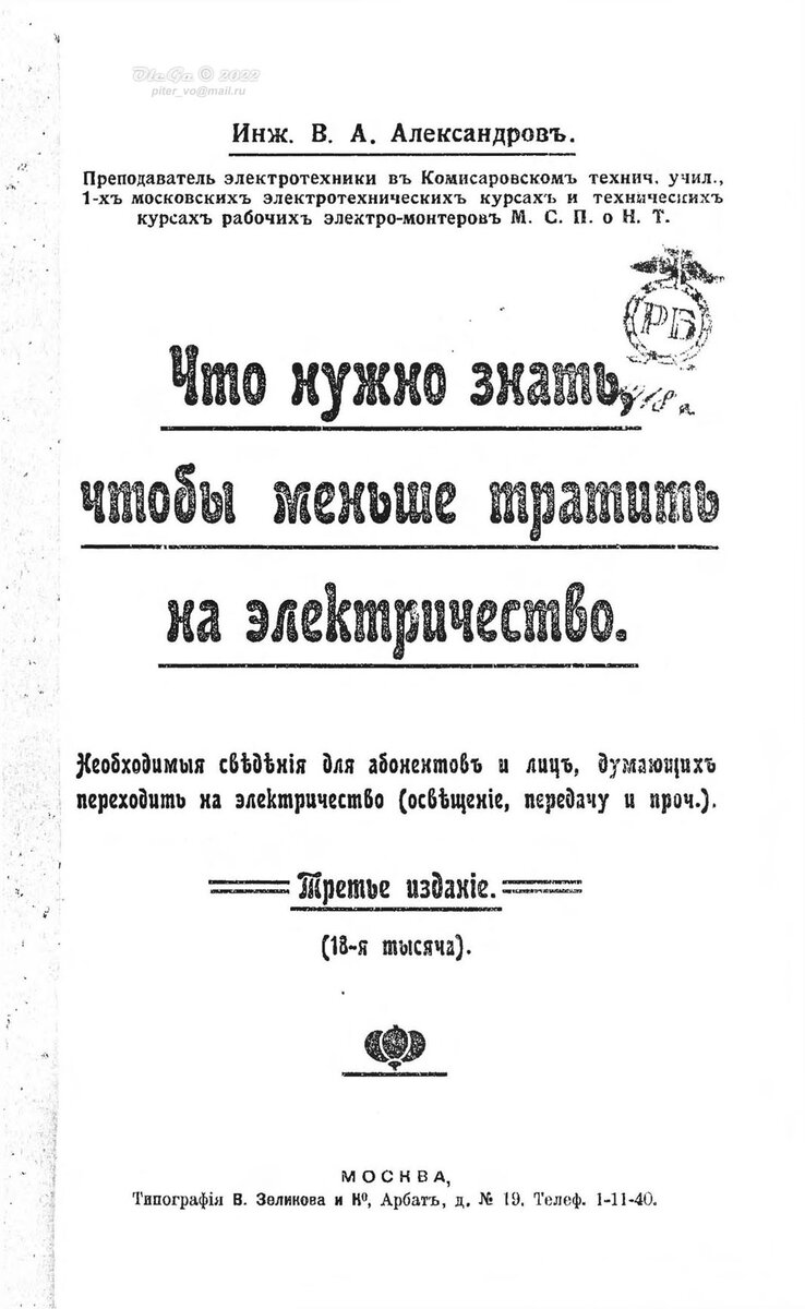 Говорят бывали пожары от электричества! Да бывали, но не во всех случаях. ... например, керосиновая лампа, будучи опрокинута, влечет за собой неминуемый пожар, а недовернутый, хоть немного, кран газового рожка - взрыв или отравление - разбитая же электрическая лампа мгновенно гаснет и не влечет за собою никакой опасности. Это обстоятельство особое значение приобретает в детских, где с электрическим освещением матери могут не беспокоиться за своих детей.