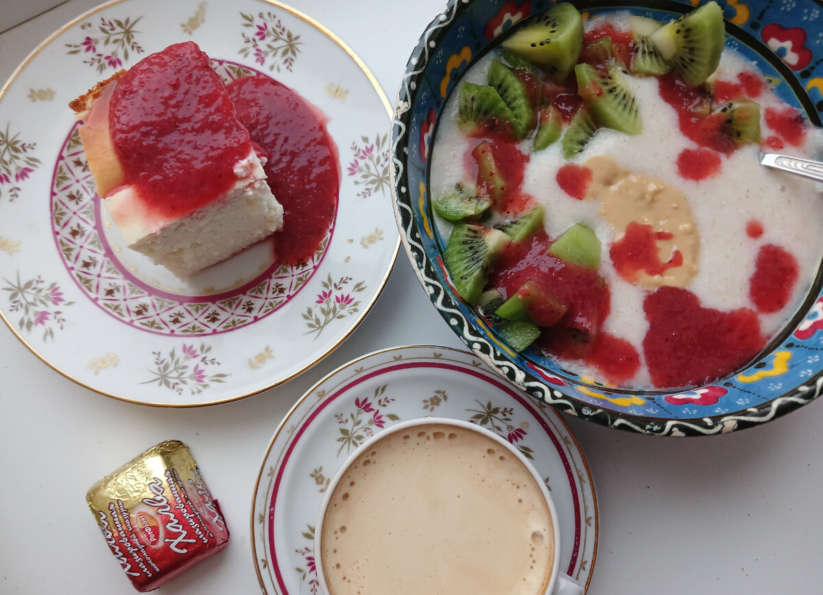 О моих запасах и расчете бюджета на месяц ЗДЕСЬ Первая покупка продуктов - Пятерочка, Вкусвилл, Дикси Покупка продуктов №2 -Вкусвилл, Вимм-Билль-Данн, Дикси Каталог рецептов На завтрак сегодня у нас манка из полбы и творожная запеканка Вкусвилл с клубникой. К манке добавила арахисовую хрустящую пасту, клубнику и порезала киви. Чашка кофе эспрессо и конфетка На обед доели борщ с курицей, который я вчера варила. После обеда на десерт мандарин съела, сыр и выпила кофе с овсяными сушками Заранее достала из морозилки 2 упаковки филе индейки, разморозила, сделала фарш и котлеты из него на ужин. На гарнир рис сварила. Испекла пирог с капустой к завтраку (на следующий день) и манник с черникой - с ним после ужина мои чай пили. Пока пеклись в духовке пироги, запекла и батат одновременно. Перед запеканием порезала на дольки и сбрызнула оливковым маслом. После запекания приправила солью, перцем и бальзамиком. Я ужинаю без риса, у меня только котлета из индейки и батат.