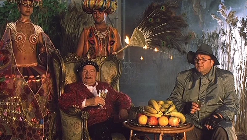 Прежде чем смотреть фильм Алексея Нужного, я решила познакомиться с давней уже работой Александра Абдулова, который первым брался за экранизацию «Бременских музыкантов». Я знала, что существует картина 2000 года под названием «Бременские музыканты & Co», но посмотреть всё как-то не получалось. Теперь увидела, хочу поделиться впечатлением, высказавшись кратко о самом главном. У режиссёра, когда он берётся за экранизацию, должна быть своя стержневая идея. У Александра Абдулова такая идея, безусловно, была. Он хотел показать, каким, по его мнению, был в действительности Советский Союз. Дело в том, что к 2000 году у большого количества людей уже сформировалась устойчивая ностальгия по СССР. Вот по ней-то Абдулова и хотел нанести удар своим кино. Почему я так решила? А это всё видно, если смотреть внимательно. Попробую объяснить подробней. Зритель видит на экране некую страну, у которой есть танки и вертолёты, но при этом в воротах королевского дворца зияют огромные дыры. В охране короля ес