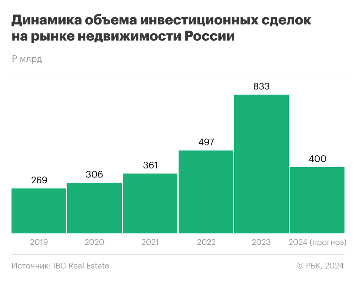 Рекордный объем инвестиций в российскую недвижимость по итогам 2023 года прогнозировали также в NF Group. По их данным, совокупный объем инвестиций в коммерческую недвижимость в России по итогам 2023 года достиг рекордных 700 млрд руб. Но в 2024 году на рынок придет охлаждение, инвестиции могут сократиться почти вдвое — до 350–400 млрд руб. А доля вложений в объекты, которые ранее принадлежали иностранным компаниям и фондам, снизится с текущих 44% до 20%.
