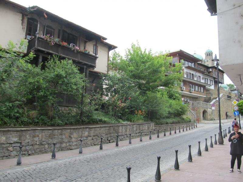 Ннемного прозы. Из крепости мы пошли гулять по старому городу. Как вы уже поняли, Тырново-город черепичных крыш, их будет ещё немало. Улицы снуют вверх и вниз, много ступенек, но хочется посмотреть всё, поэтому поднимались и спускались, как угорелые. В промежутках пили фреш и холодный кофе-фрапе, потом посетили пару магазинов (кроссовки, серебро, но ничего не купили) и пошли обедать. И тут откуда ни возьмись налетает зашибись ураган! Мы мирно ели и пили, но после ветра начался тропический ливень, пришлось убираться с улицы внутрь ресторана. Я играла на губе - приближалось время отъезда, а выйти из укрытия не представлялось возможным. Минут за пять до дедлайна не то чтобы просияло, но стало возможным выйти и поймать такси. Только нас привезли, и мы присели под сень вокзальной крыши, как ливануло опять!