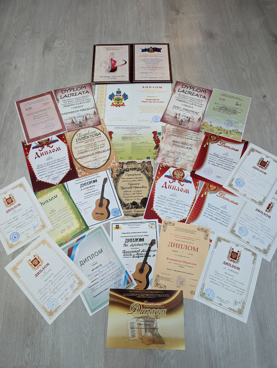 На днях моя жена решила навести порядок в нашем шкафу, каково было ее удивление найти папку покрытую пылью на верхней полке. В годы юности и студенчества я как и многие музыканты стремился за победами и достижениями. С девяти лет я начал участвовать в концертах и конкурсах, а к шестнадцати годам я впервые выехал из страны за своей первой крупной победой в Европу. С того момента я приобрёл колоссальную цель. И загорелся поступлением в консерваторию. В общем и целом я уже 20 год своей жизни посвящаю музыки и ни о чем не жалею, изучаю стили, композиции, оборудование. Веду концертную и педагогическую деятельность, пишу музыку под заказ. Музыка и в целом искусство сильно помогает в развитие всестороннего мышления, памяти и помогает снижению стресса. И с моей точки зрения я считаю, что никогда не поздно начать играть на музыкальном инструменте.