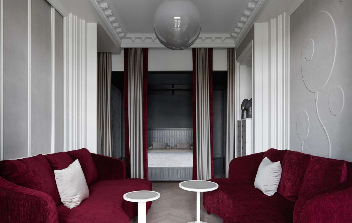 В нише в гостиной обустроили полноценную спальню. Стены в ней отделаны замшей с «пальчиковым эффектом». Этот теплый, тактильно приятный материал придает пространству статусность и благородность. Над изголовьем кровати — декоративное панно, выполненное по эскизам дизайнера. Углубления в шкафах по обеим сторонам кровати служат вместо прикроватных тумбочек. В них помещаются лампы для чтения и встроены розетки для зарядки телефонов. Зеркало на потолке в спальне смотрится эффектно и неординарно, оно придает легкость и визуально увеличивает пространство.