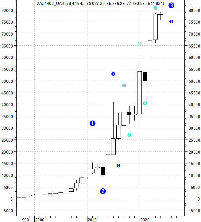 1. Стоимость унции золота в гривнах, гривен за тр. унцию 1997-2023, годовые свечи. 1. 1 Стоимость унции золота в гривнах, гривен за тр. унцию 1997-2023, годовые свечи. Второй вариант разметки голубых волн Элиота. 2. Стоимость унции золота в гривнах, гривен за тр. унцию, 2010-2023, квартальные свечи. 3. Стоимость унции золота в гривнах, гривен за тр. унцию, 2020-2023, месячные свечи. 4. Стоимость доллара США в гривнах, USDUAH, гривен за доллар США, 1997-2023, годовые свечи. 5.1 Стоимость доллара США в гривнах, USDUAH, гривен за доллар США, 2008-2023, месячные свечи. 5.2 Стоимость доллара США в гривнах, USDUAH, гривен за доллар США, 2013-2023, месячные свечи. 5.3 Стоимость доллара США в гривнах, USDUAH, гривен за доллар США, 1997-2023, квартальные свечи. 6.1 Курс гривны к рублю по данным ЦБ РФ, рублей за гривну, 1996-2024г., годовые свечи. 6.2 Курс гривны к рублю по данным ЦБ РФ, рублей за гривну, 2013-2024г., месячные свечи.