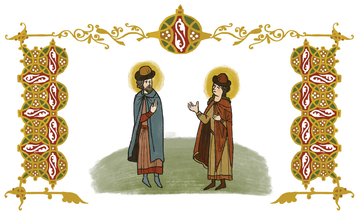 Архивариус: Вот посмотрите-ка на эти иконы. Они изображают Бориса и Глеба. Одна из них — так называемая житийная: в центре Борис и Глеб, а вокруг, на полях иконы в квадратиках — клеймах — эпизоды из их жития. Может быть, кто-то захочет нарисовать один из эпизодов, о которых рассказано выше, — по-своему, конечно.