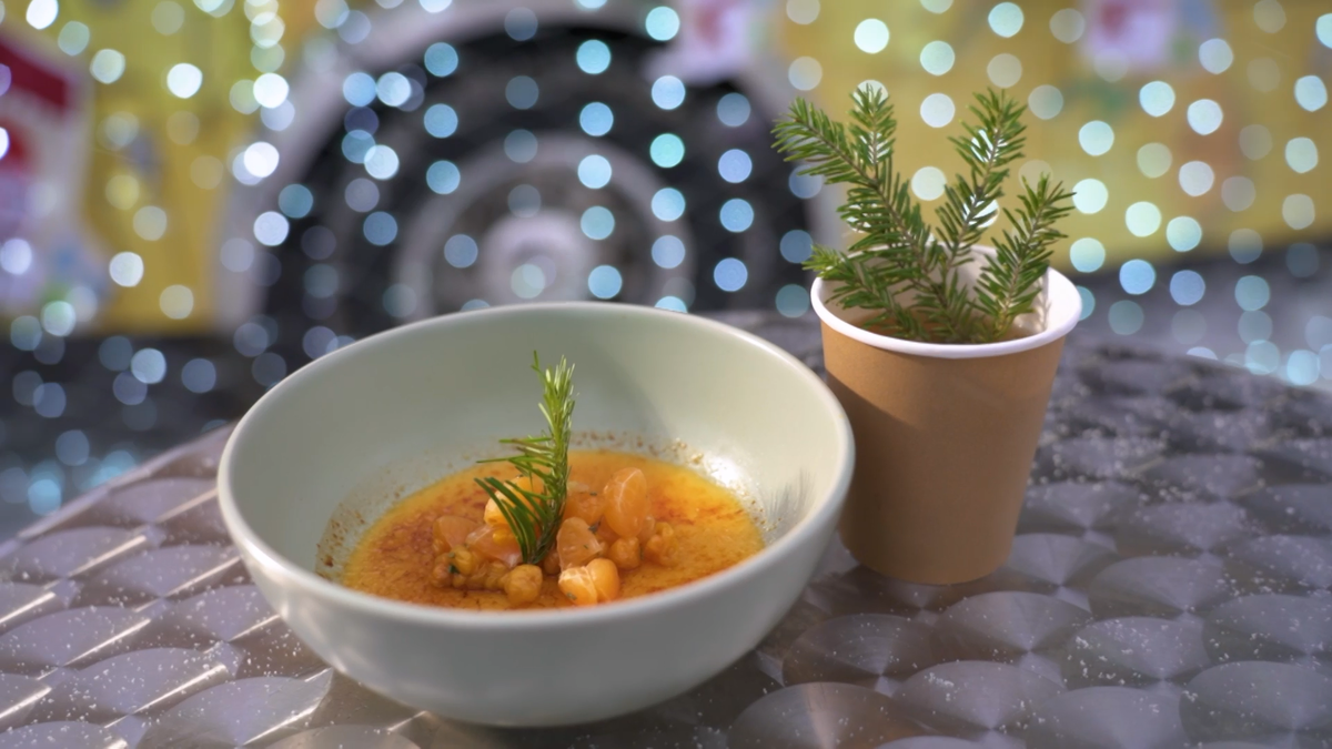 😋 Готовим крем-карамель: Желток — 120 г Сок облепихи и рябины — 100 г Сахар — 80 г Сливки 33% — 330 г 1. Соедините все ингредиенты и пробейте в блендере. Затем процедите через сито. 2. Разлейте смесь по четырём не сильно широким чашам и запекайте в духовке 1 час при 90°C. 3. Поставьте готовый крем в холодильник на 3–4 часа. 🌿 Делаем салат из морошки и мандарина: Мандарин очищенный — 1,5 кг Морошка в собственном соку — 100 г Розмарин — 5 г Мёд — 30 г 1. Мандарины очистите от белых прожилок. Каждую дольку порежьте пополам. 2. Соедините подготовленные мандарины и морошку. Заправьте мёдом и измельчённым розмарином. 🍽️ Оформляем блюдо: 1. Крем-карамель перед подачей посыпьте ложкой сахара. Распределив его равномерно, обожгите горелкой до карамельной корочки. 2. Подайте с салатом из ягод и розмарина, украсив веточкой зимней ели. Подписывайтесь на наш канал: https://dzen.ru/povaranakolesah
