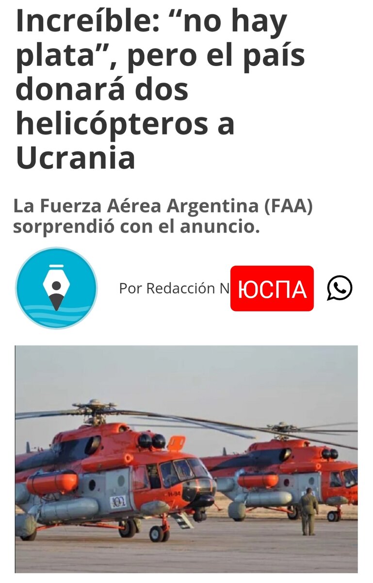 Аргентина определяется со стороной в противостоянии Запад - Россия. Несколько дней назад президент Аргентины Хавьер Милей письменно уведомил Россию и Китай, что его государство сворачивает планы по вступлению в БРИКС. Сегодня обнаружился ещё один, более раний, сигнал. Дело в том, что аргентинские ВВС решили передать украинской стороне два российских вертолёта МИ-171Е. Данные воздушные средства были произведены в России для использования аргентинцами в арктический операциях, однако сейчас требуют капитального ремонта, что, как мы знаем, украинское руководство ещё не останавливало. Более того, передача либо продажа техники военного назначения по "международным правилам" возможна только с разрешения производителя. Посол России в Буэнос-Айрес Феоктистов так отреагировал на аргентинские планы: "Мы категорически против их передачи противникам России" ЮСПА