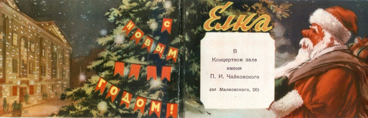 Праздновать Новый год в советском государстве начали с 1935 года. Проводили новогодние ёлки для детей в Москве с 1937 года. Главной новогодней площадкой до 1961 года был Колонный зал Дома Союзов. Но остальные площадки Москвы тоже не оставались в стороне. В нашем собрании есть один прекрасный новогодний набор документов, посвященный встрече нового 1952 года в Концертном зале имени П.И. Чайковского. Начнем с билета. Неизвестно, были ли на эту ёлку отдельно оформленные билеты, или проход был по простым театральным билетам, найти нигде не удалось. Но возьмём билет без указания года на ту же площадку. Оформление типично для того времени: ёлка в украшениях, Дед Мороз с подарками... Но интересно не столько приглашение на ёлку, сколько программка и сопутствующие летучие издания. Помимо образов Деда Мороза, Снегурочки, Бабы-Яги и сказочных животных, мы видим здесь представителей разных народностей, как населявших Советский Союз, так и "индуса", "китайца" и "француженку". Русский, конечно же - "