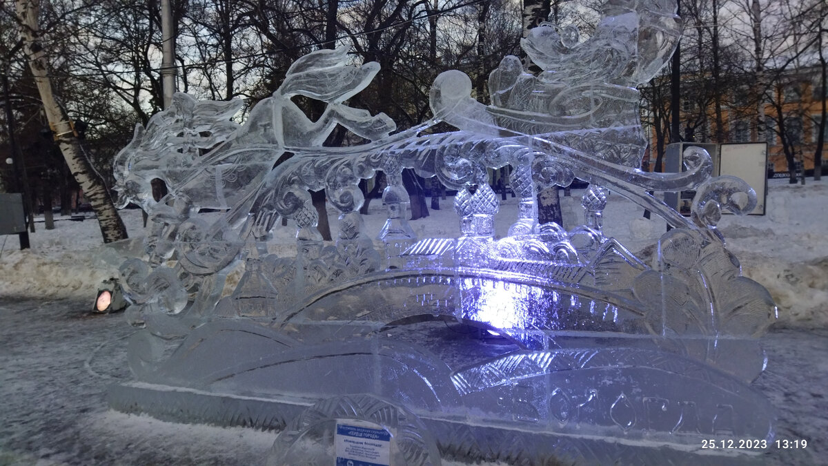 Интересный и зрелищный фестиваль ледовых скульптур прошел в Вологде в конце декабря. Фестиваль проходит в нашем городе уже второй раз. Впервые мастера делали свои ледовые фигуры в скейт-парке «Яма» 17-19 февраля 2023 года. Можно почитать о первом фестивале в моей статье. А второй фестиваль прошел в конце года уже на другой площадке, на площади Революции рядом с главной елкой города. Вот она какая, главная елка – красавица, хоть и искусственная. Площадь Революции украшена шарами и вологодскими символами – кружевными снежинками. Для детишек построили ледяную горку. Как и на первый фестиваль, лед привезли с озера Тарногского района. Участников стало больше, всего 14 команд из разных регионов России и республики Беларусь. Темой второго фестиваля стали вологодские символы – кружева, деревянное зодчество, резной палисад, народные промыслы. «Чудо, эти кружева!» - команда «Олонец» «Резной палисад» - команда из Вельска. Узнаваемая фигура Петра Первого. И кстати, в Вологде отреставрирован дом-
