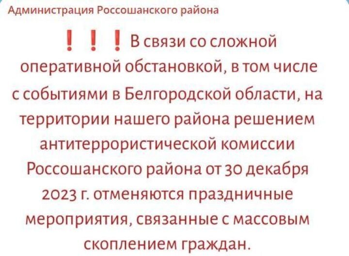 Массовые новогодние мероприятия отменены в трёх приграничных районах Воронежской области — Россошанском, Кантемировском и Ольховатском. Произошло это в связи «со сложной оперативной обстановкой, в том числе с событиями в Белгородской области». Районные антитеррористические комиссии своим решением от 30 декабря запретили все праздничные мероприятия, связанные с массовым скоплением граждан. Соответствующую информацию разместили районные администрации в своих телеграм-каналах. Напомним, сегодня днём, в субботу, 30 декабря, в результате обстрела центра Белгорода со стороны Украины погибли 14 человек: 12 взрослых и двое детей. Ещё 108 человек, включая 17 детей, ранены. Ракеты прилетели прямо на центральную площадь, где расположены здание правительства Белгородской области и новогодняя ёлка с катком. Также были удары по жилым кварталам. После обстрела Белгорода губернатор Воронежской области Александр Гусев призвал воронежцев отказаться от пиротехники на Новый год.
