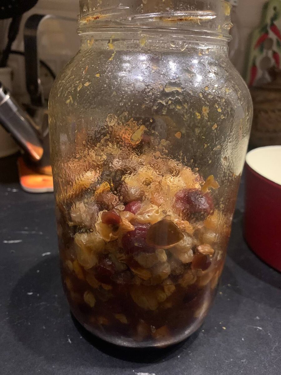 За день до: Смешать сухофрукты, цедру, цукаты с коньяком в большой миске. Заварить крепкий чай и горячим вылить на сухофрукты, перемешать и дать постоять 6-8 часов. Сварить сироп из сахара, воды и сока, влить коньяк и сразу вылить на сухофрукты, накрыть миску пленкой и оставить на ночь.