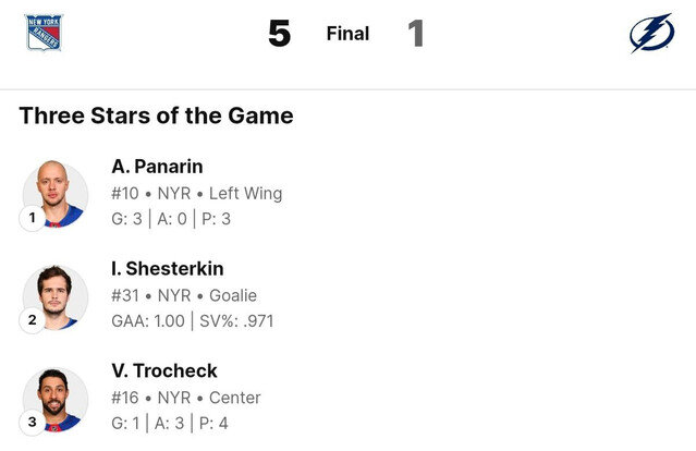 Артемий Панарин феерично завершил календарный 2023-й год, пополнив свой снайперский счет сразу на 3 шайбы. 32-летний российский нападающий «Рейнджерс» стал главным героем победного для «синерубашечников» матча с «Тампой» (5:1), эффектно оформив хет-трик. Все голы в исполнении Хлебушка получились на загляденье: все началось с отличного завершения быстрой атаки, продолжилось шикарным обыгрышем Виктора Хедмана за счет классной техники с последовавшим быстрым броском, а завершилось фирменным кистевым в угол ворот Андрея Василевского. Не было никаких сомнений, что именно Панарин станет первой звездой встречи, по версии НХЛ. Ярчайший перфоманс Артемия вдохновил американских поклонников хоккея. @JLazzy23:– Когда Панарин бросает по воротам, случается настоящая магия. @Jim9482:– Панарин – пожалуй, самый классный хоккеист за всю историю «Рейнджерс». Он настолько круто играет в атаке, что другая его работа часто остается без должного внимания и оценки. А ведь он здорово прессингует соперников, за